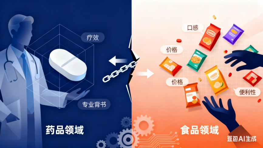 药品立足于“疾病的专业解决方案”,其核心是疗效,决策受专业意见主导,价格敏感度较低;而食品则是“日常的消费选择”,决策由口感、便利、价格及健康概念等多元因素驱动,市场竞争更为充分。