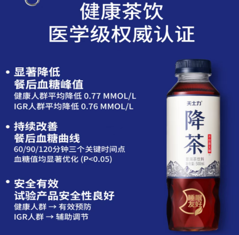 例如,天士力“降茶”率先在国内完成“动物模型+人体临床”双试验认证,首次以食品级标准系统验证无糖茶对血糖的调节效果,实现了从基础实验到人体临床的完整科学闭环,填补了国内该领域的研究空白。其开展的72例样本(健康人/IGR人群1:1)的随机对照试验,证实健康人群、IGR人群餐后血糖峰值均显著降低,且安全性良好;依托天士力31年医药研发积淀,开创“健康增益”的即饮茶3.0时代,锚定血糖健康关注群体,提供科学循证的日常控糖茶饮选择。