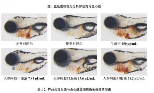 固本堂为验证人参阿胶口服液的功效,联合环特生物开展斑马鱼实验,通过每组30尾斑马鱼的对比测试,证实该产品能增强斑马鱼心脏红细胞染色强度,促进巨噬细胞吞噬功能并改善T细胞减少,明确其在改善贫血、增强免疫力方面的作用。